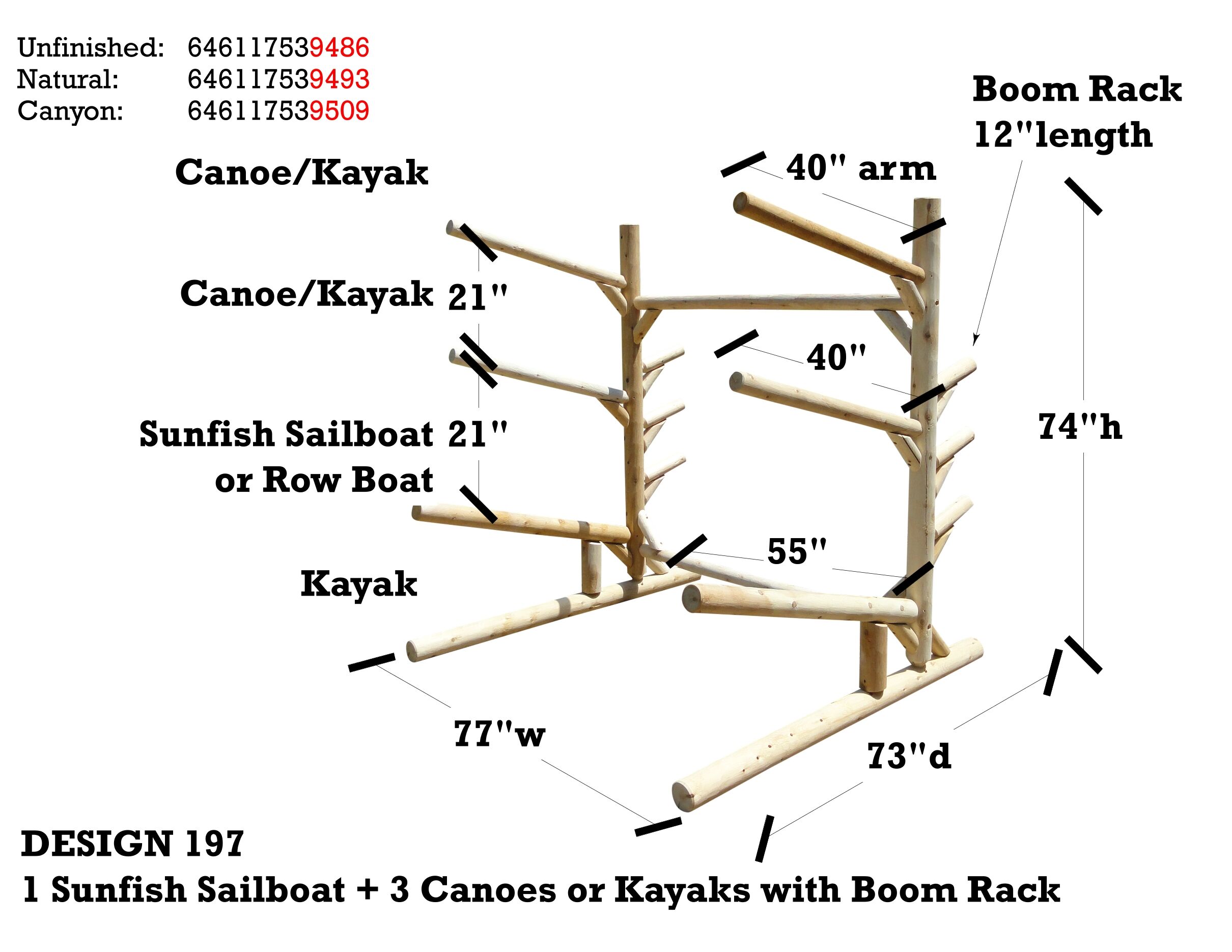 The 1-Sunfish Sailboat + 3 Canoes or Kayak with boom rack is built with Northern White Cedar from the Upper Peninsula of Michigan. The Sunfish Boom fits on the back of the rack. This rack is designed for functionality and aesthetics by lake homeowners. It not only cares for and organizes your boats, but it can also be matched to its surroundings being log construction.