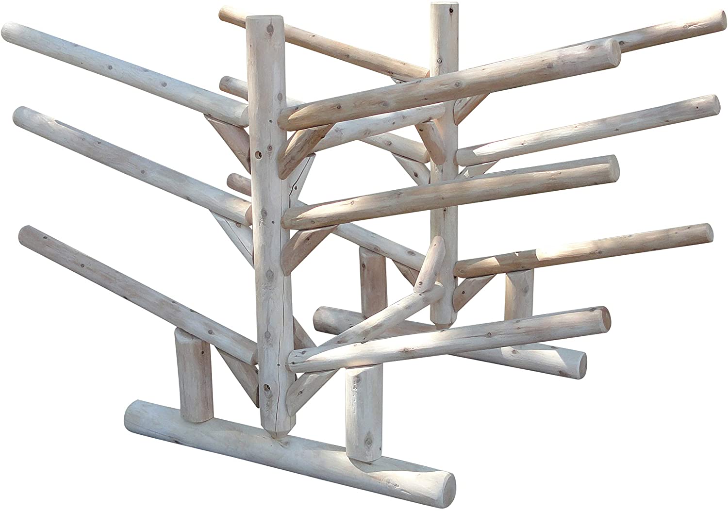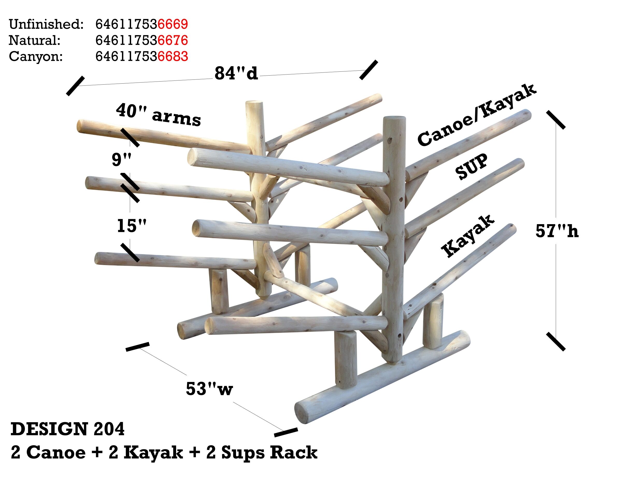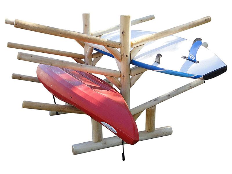The freestanding 2 Canoe + 2 Kayak + 2 SUPS Rack is built with Northern White Cedar from the Upper Peninsula of Michigan. This rack is designed for functionality and aesthetics by lake homeowners. It not only cares for and organizes your boats, but it can also be matched to its surroundings being log construction.
