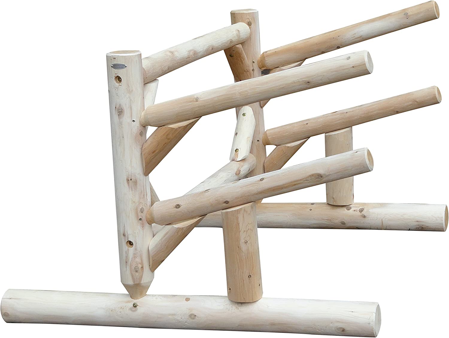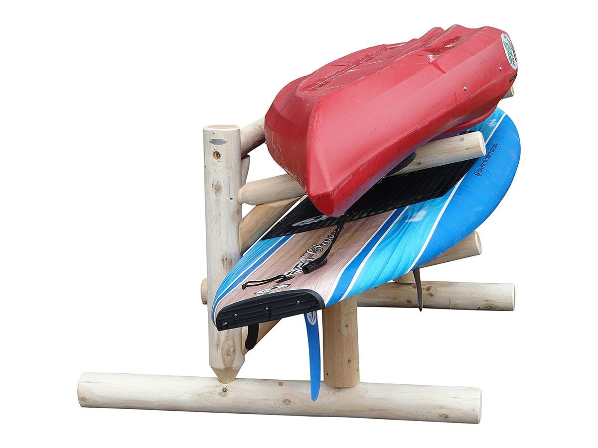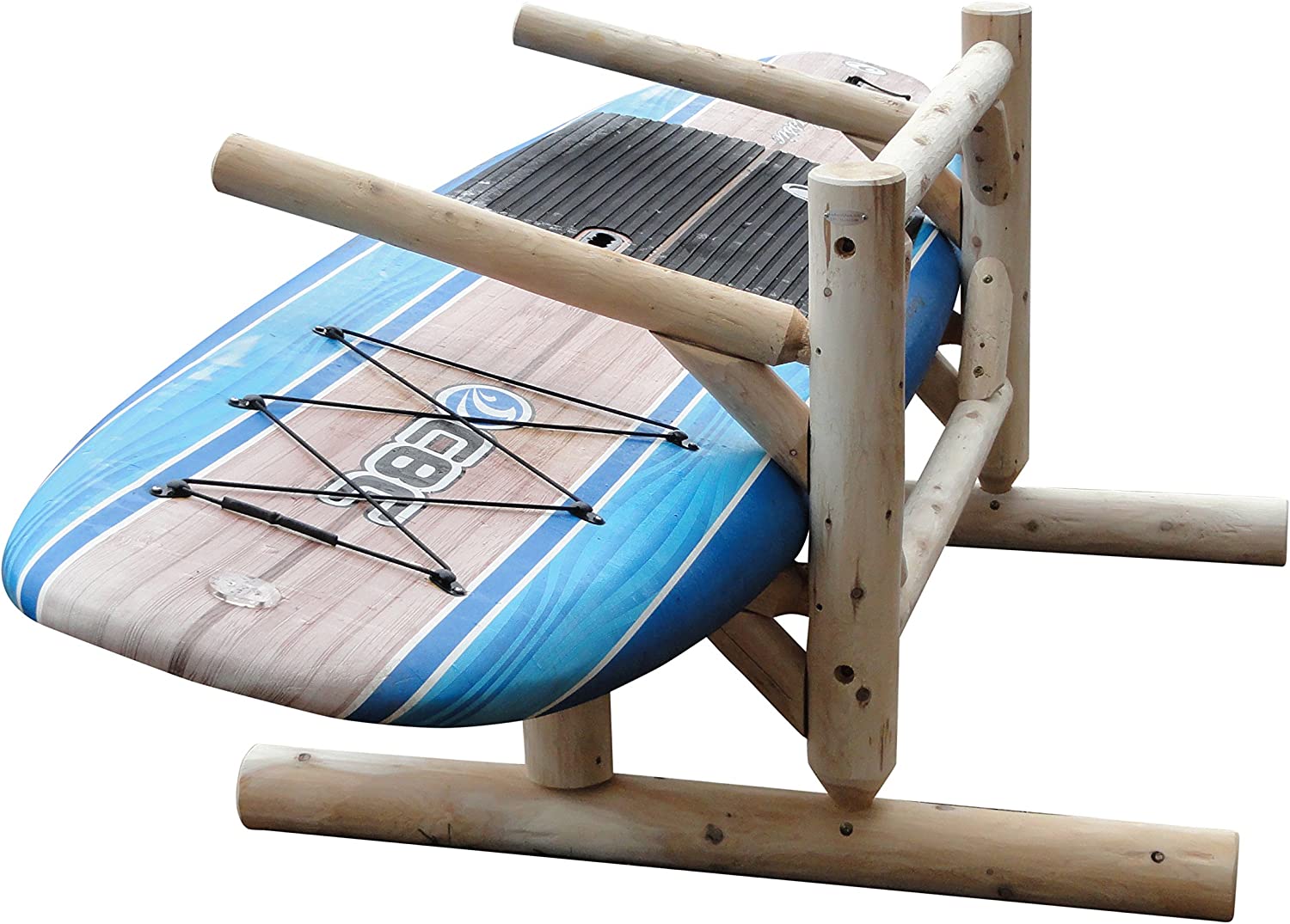 The 2-Place 1-Sided SUP Storage Rack is built with Northern White Cedar from the Upper Peninsula of Michigan. This rack is designed for functionality and aesthetics by lake homeowners. It not only cares for and organizes your boats, but it can also be matched to its surroundings being log construction.