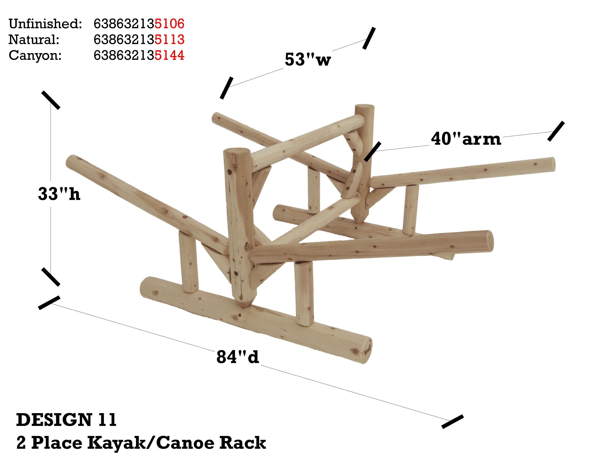 The 2 Place Double Sided Kayak Rack is constructed from Northern White cedar which is rated best for weather resistant. Each rack has 4 5/8 inch post and feet and 3 in rails. Each rack is glued, bolted, and screwed with galvanized screws. Joinery where arms meet posts are 2 inch mortise and tenon giving full strength. Kayak Rack comes disassembled, but is very simple to put together with the torque-bit found in assembly kit and a cordless drill or the like.