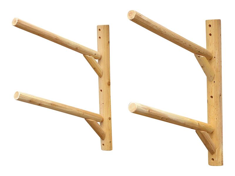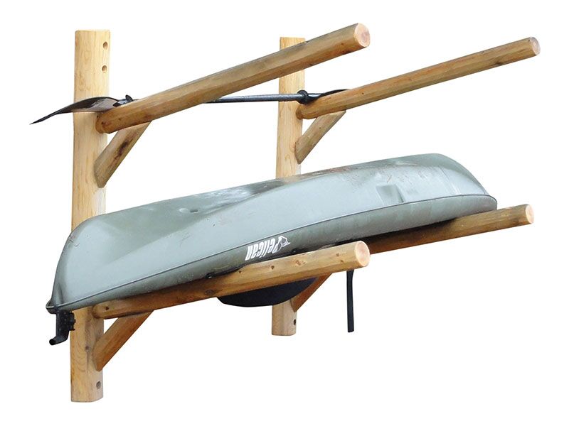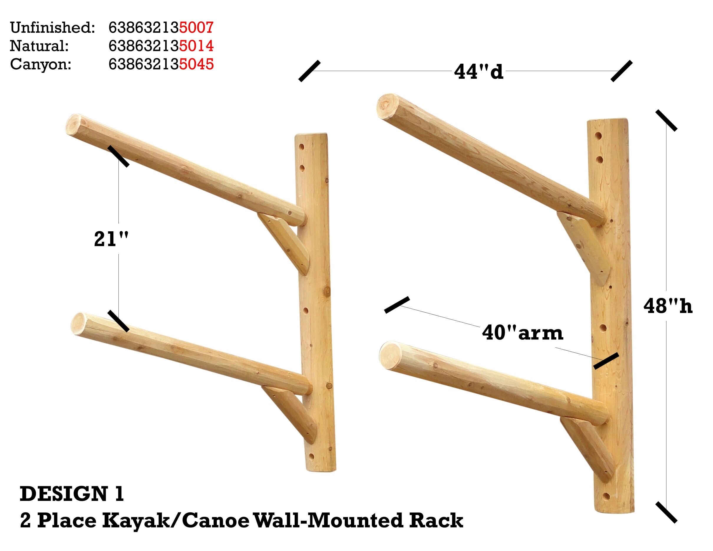 The 2 Place Wall Mountable Kayak Rack is constructed from Northern White cedar which is rated best for weather resistant. Each rack has 4 5/8-inch post and feet and 3 in rails. Each rack is glued, bolted, and screwed with galvanized screws. Joinery where arms meet posts are 2-inch mortise and tenon giving full strength. Kayak Rack comes disassembled, but is very simple to put together with the torque-bit found in assembly kit and a cordless drill or the like.