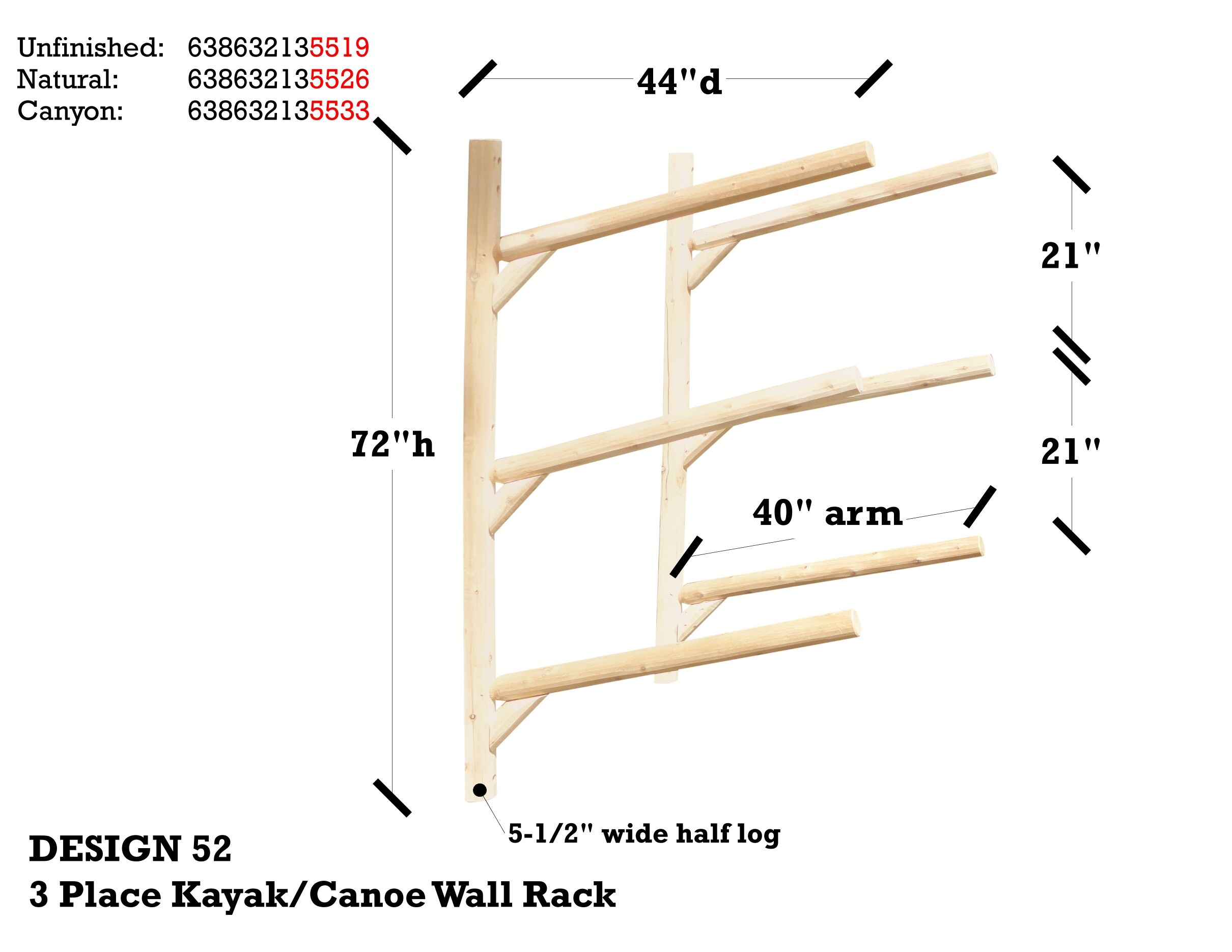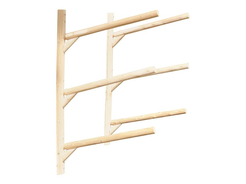 The 3 Place Wall Mountable Kayak Rack is constructed from Northern White cedar which is rated best for weather resistant. Each rack has 4 5/8 inch post and feet and 3 in rails. Each rack is glued, bolted, and screwed with galvanized screws. Joinery where arms meet posts are 2 inch mortise and tenon giving full strength. Kayak Rack comes disassembled, but is very simple to put together with the torque-bit found in assembly kit and a cordless drill or the like.
