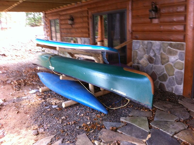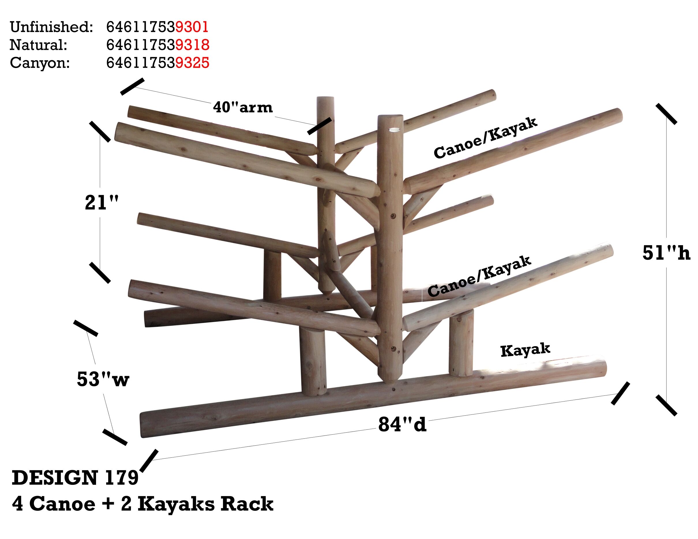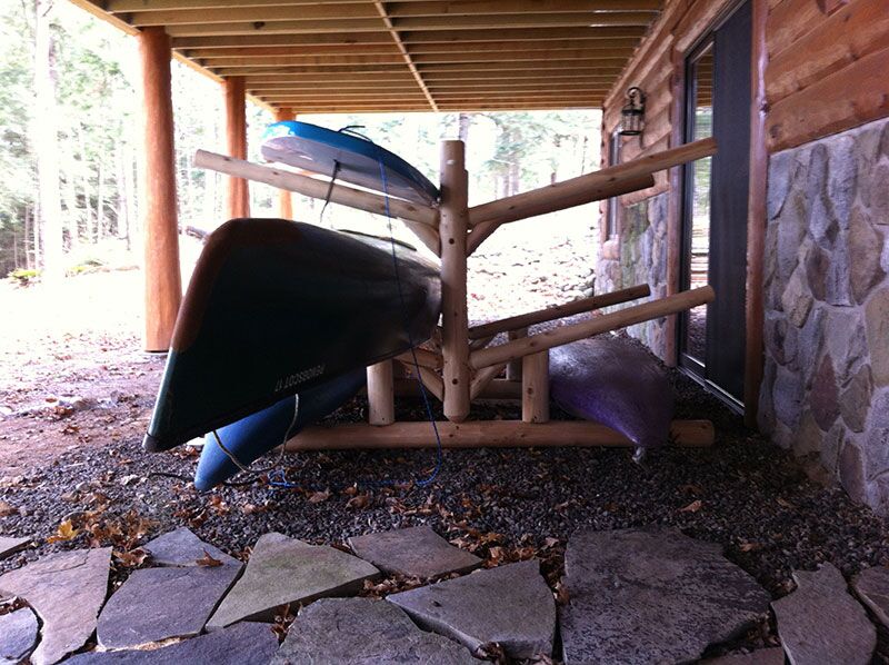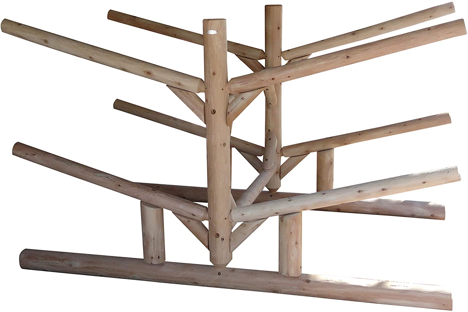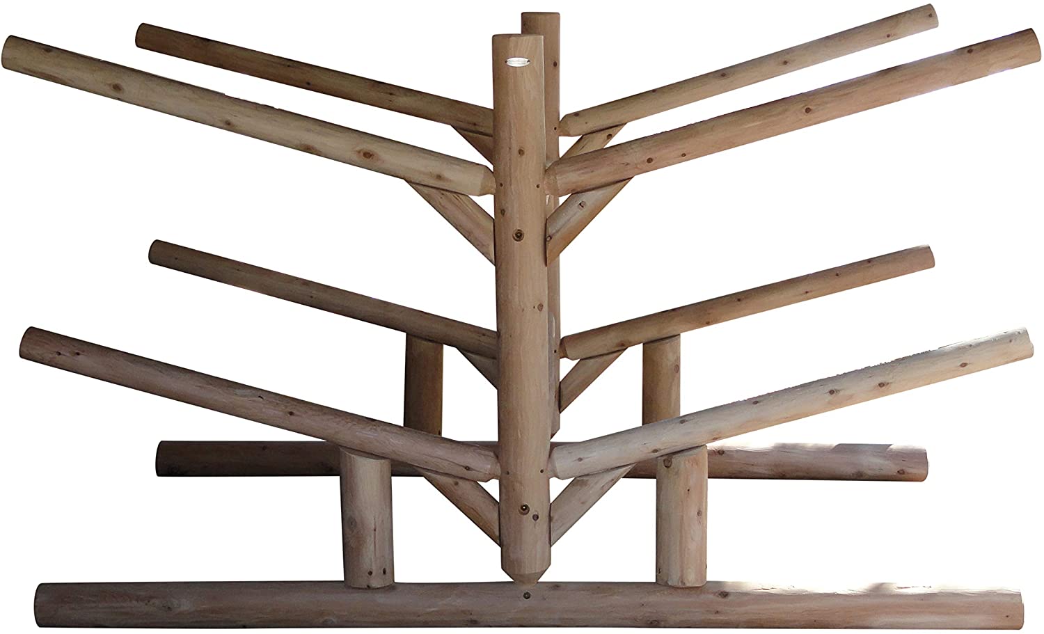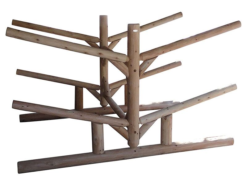 The freestanding 4 Canoe + 2 Kayak Rack is built with Northern White Cedar from the Upper Peninsula of Michigan. This rack is designed for functionality and aesthetics by lake homeowners. It not only cares for and organizes your boats, but it can also be matched to its surroundings being log construction.