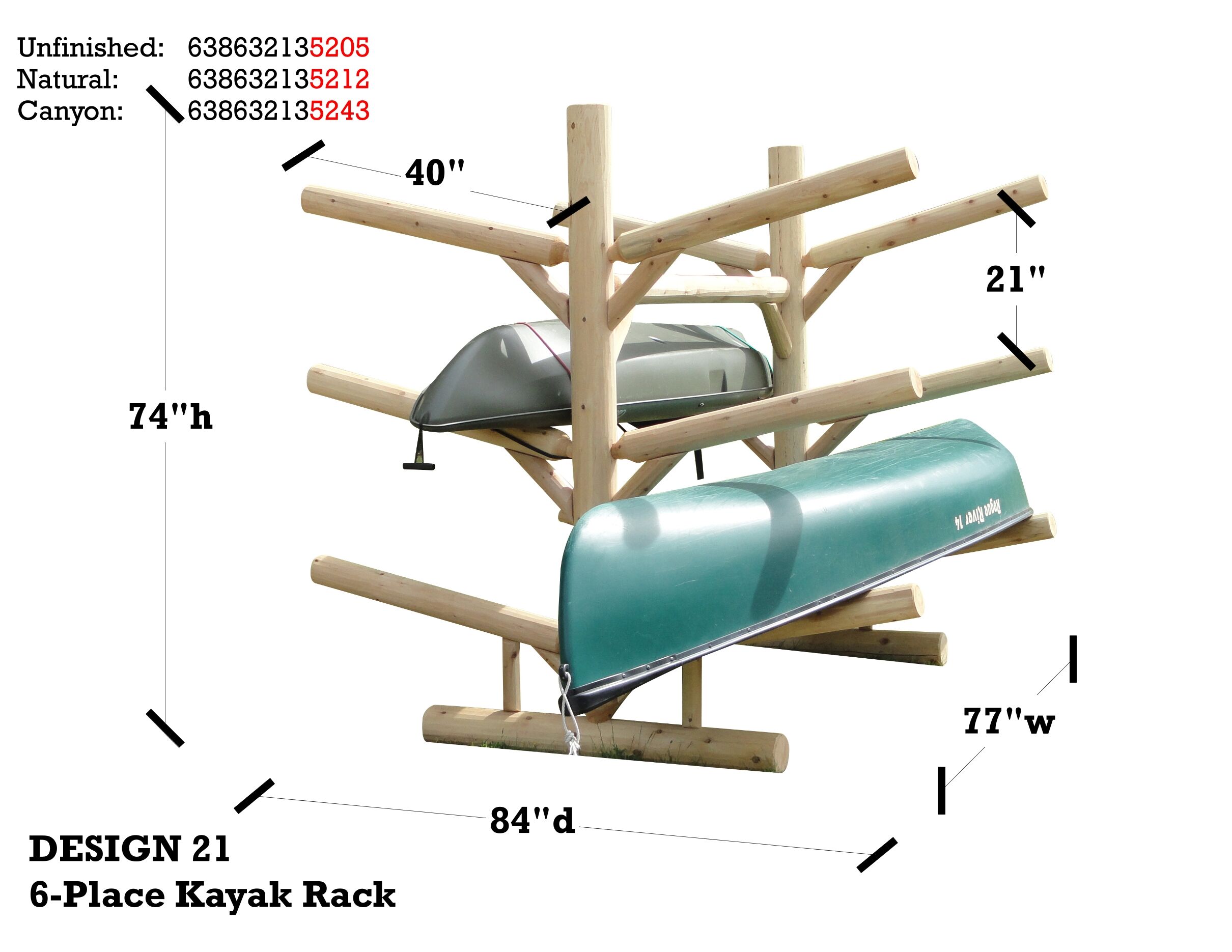 The 6 Place Kayak Rack is constructed from Northern White cedar which is rated best for weather resistant. Each rack has 4 5/8 inch post and feet and 3 in rails. Each rack is glued, bolted, and screwed with galvanized screws. Joinery where arms meet posts are 2 inch mortise and tenon giving full strength. Kayak Rack comes disassembled, but is very simple to put together with the torque-bit found in assembly kit and a cordless drill or the like.
