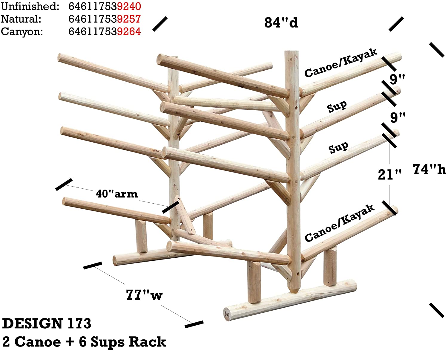 8-Place 2 Canoe + 6 SUP Board Rack is constructed from Northern White cedar which is rated best for weather resistant. Each rack has 4 5/8 inch post and feet and 3 in rails. Each rack is glued, bolted, and screwed with galvanized screws. Joinery where arms meet posts are 2 inch mortise and tenon giving full strength. Rack comes disassembled, but is very simple to put together with the torque-bit found in assembly kit and a cordless drill or the like.