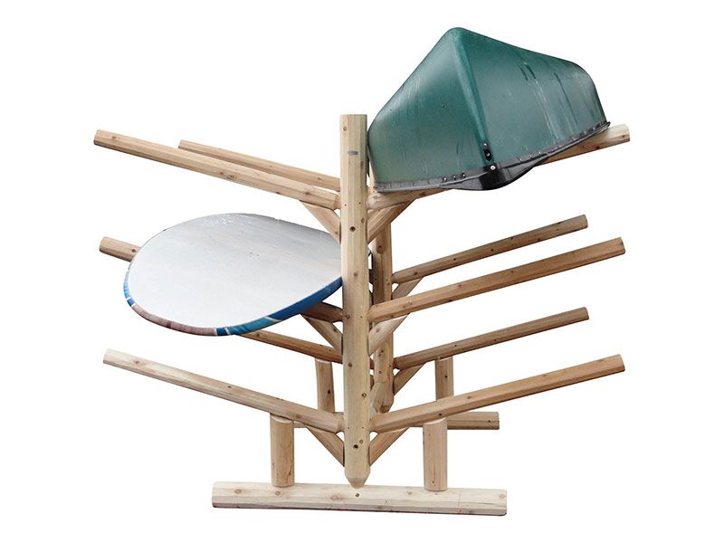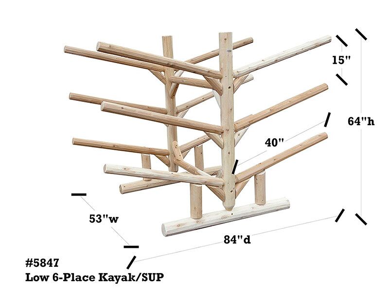 The Low 6 Place Kayak & SUP Rack is constructed from Northern White cedar which is rated best for weather resistant. Each rack has 4 5/8 inch post and feet and 3 in rails. Each rack is glued, bolted, and screwed with galvanized screws. Joinery where arms meet posts are 2 inch mortise and tenon giving full strength. Kayak Rack comes disassembled, but is very simple to put together with the torque-bit found in assembly kit and a cordless drill or the like.