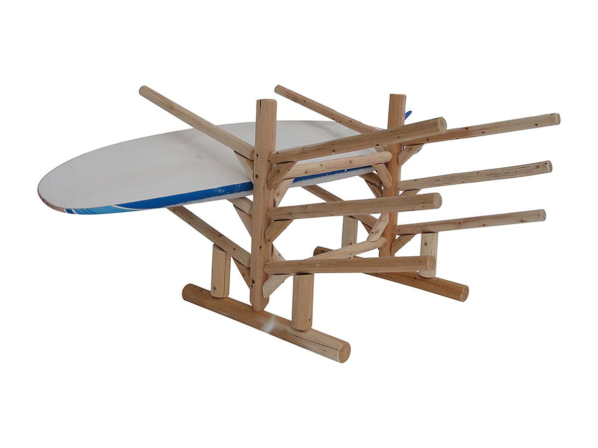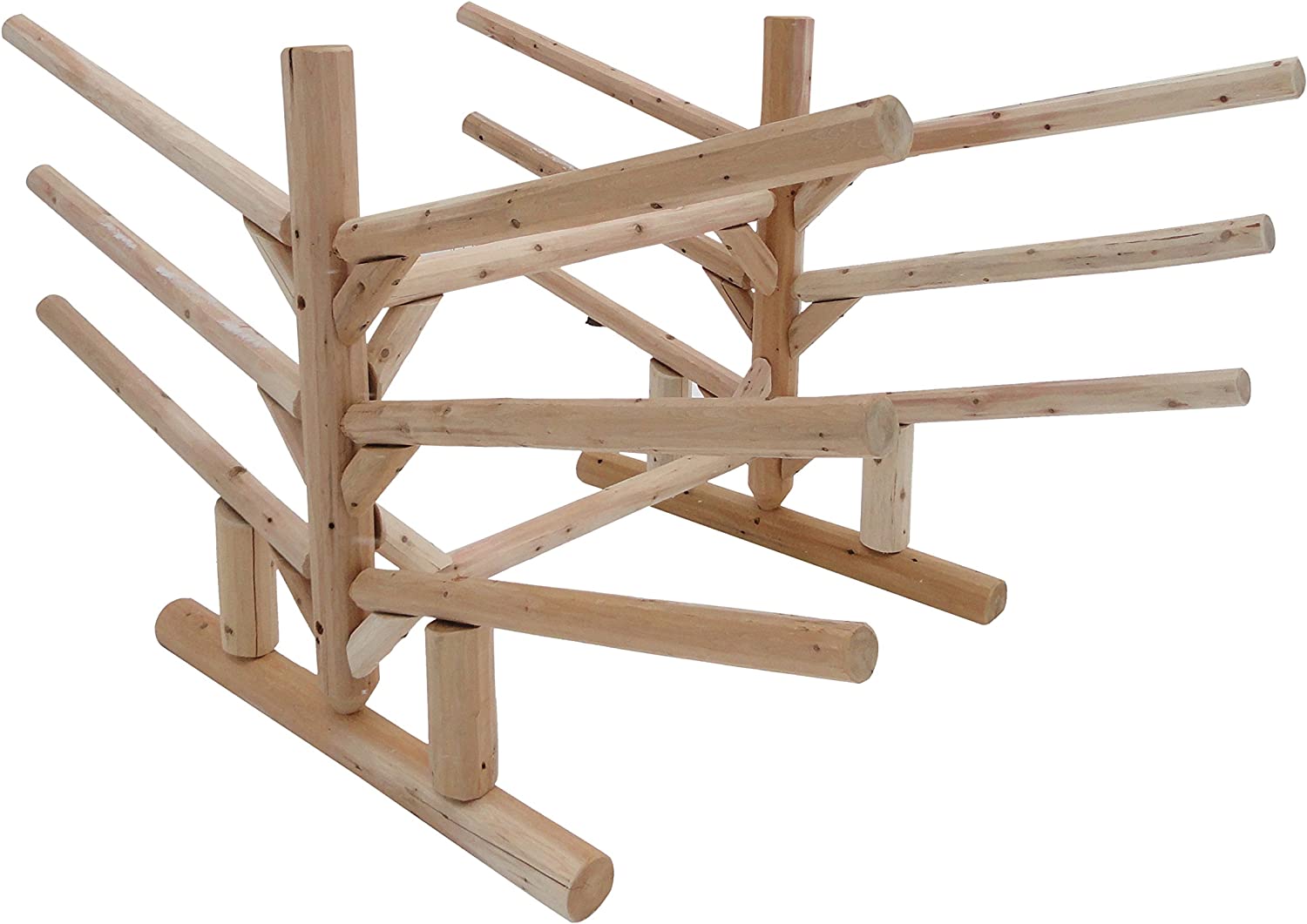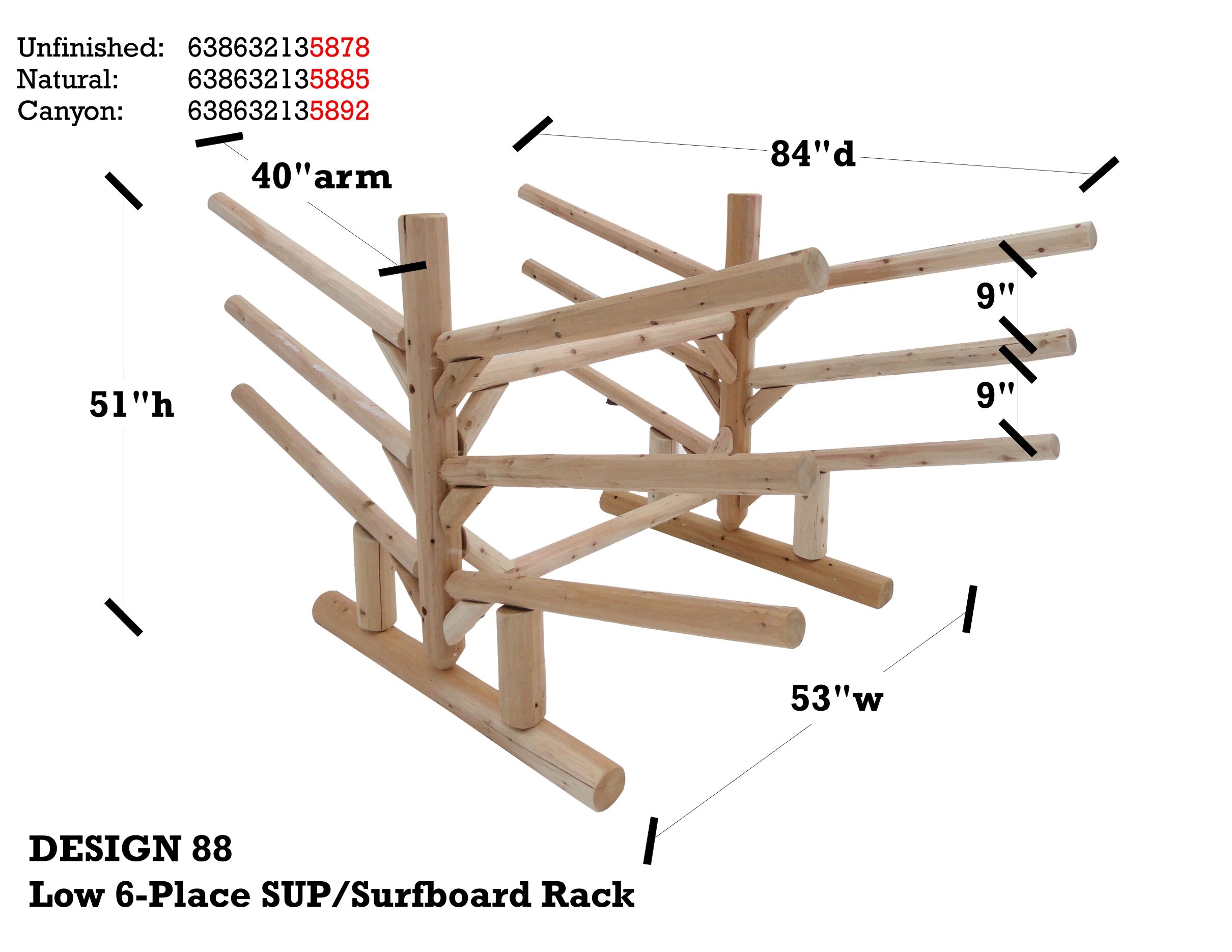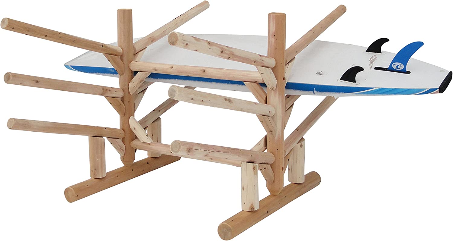 The freestanding Low 6-Place SUP and Surfboard Rack is built with Northern White Cedar from the Upper Peninsula of Michigan. This rack is designed for functionality and aesthetics by lake homeowners. It not only cares for and organizes your boats, but it can also be matched to its surroundings being log construction.