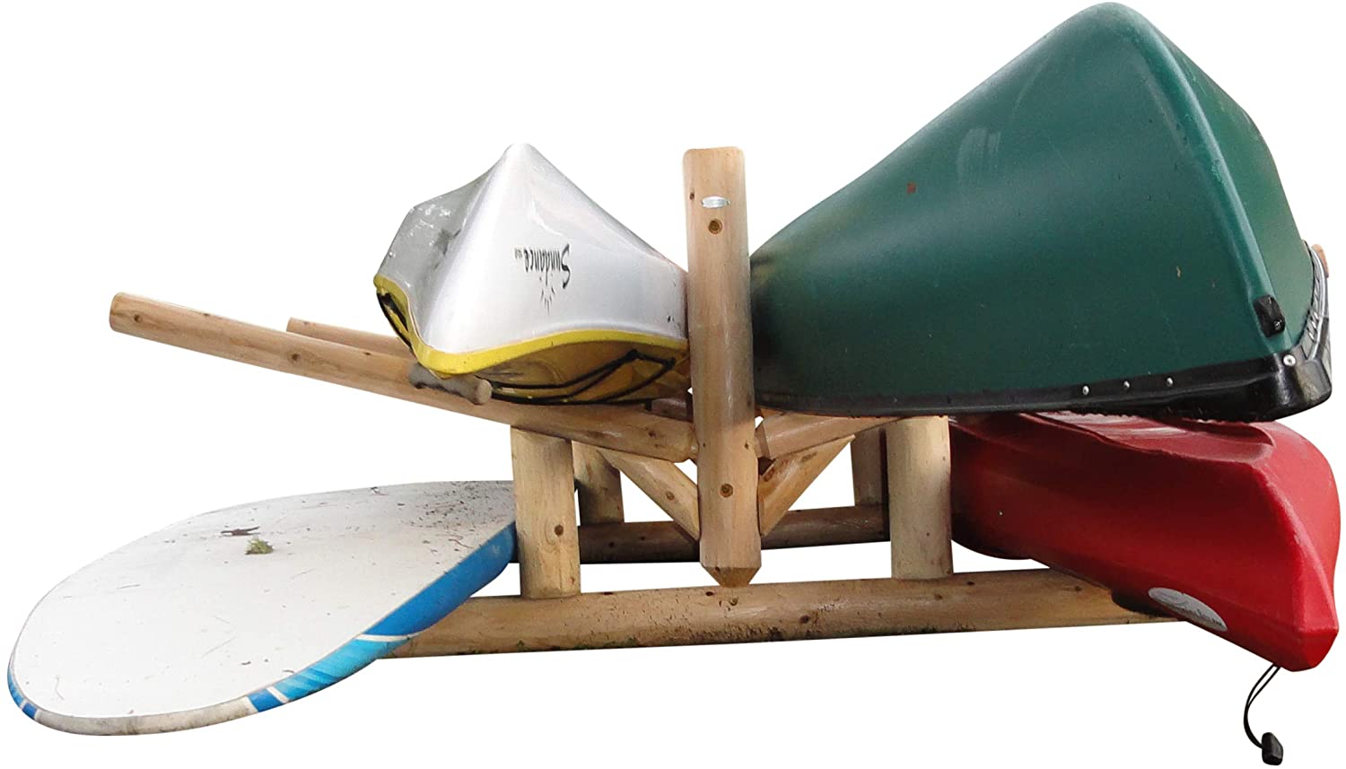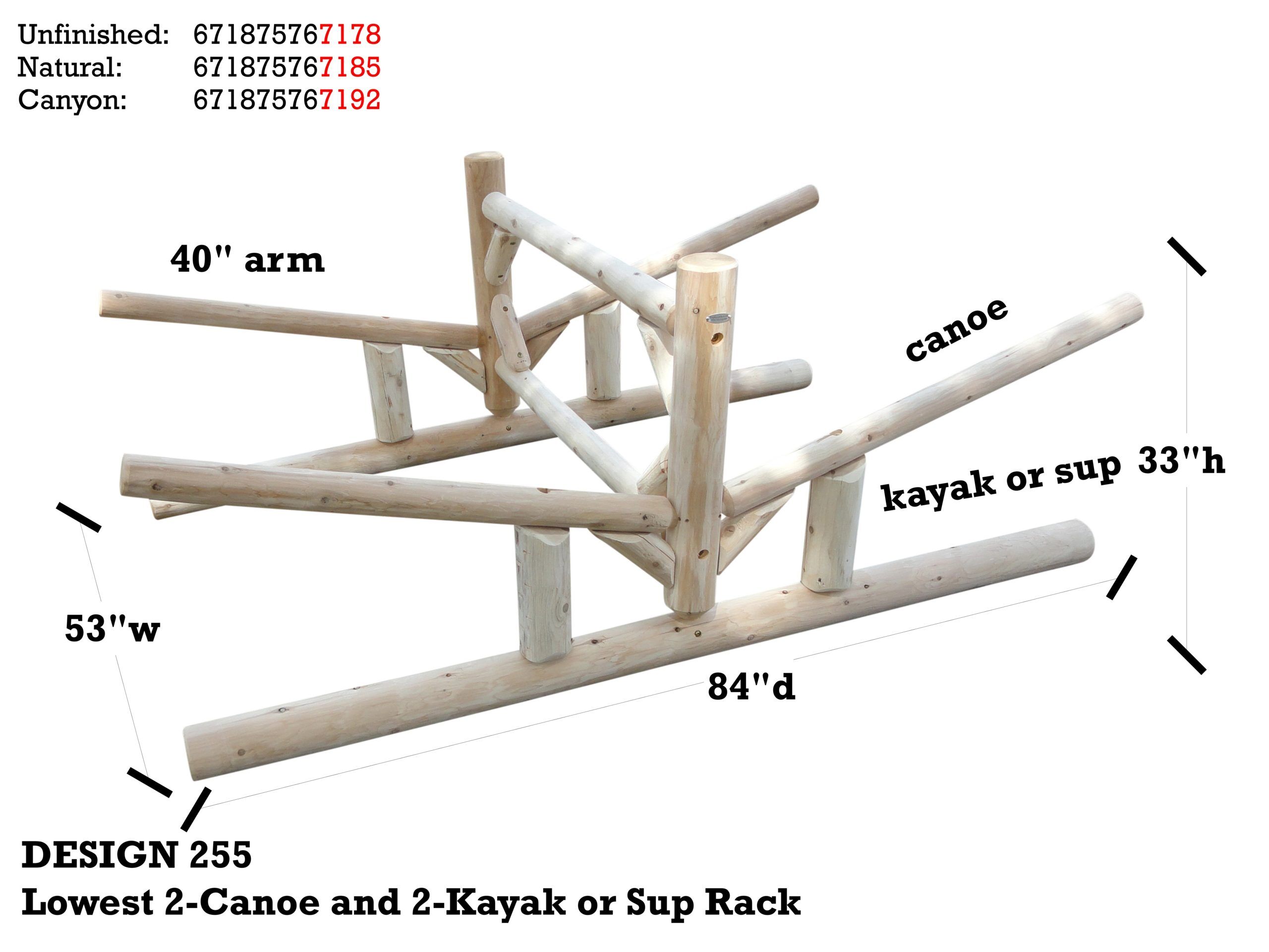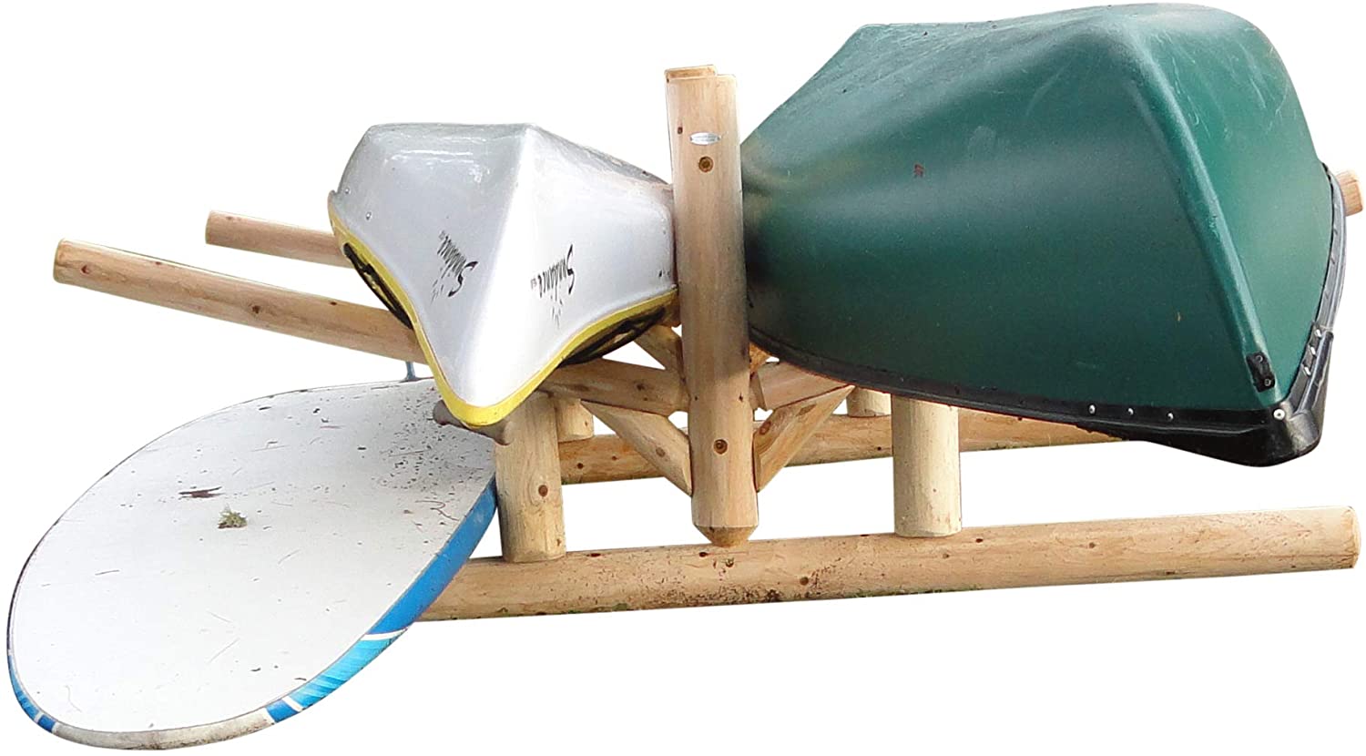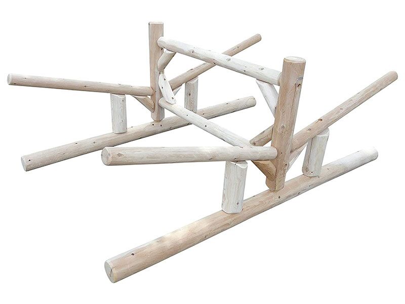 The freestanding Lowest 2-Canoe + 2-Kayak/SUP is built with Northern White Cedar from the Upper Peninsula of Michigan. This rack is designed for functionality and aesthetics by lake homeowners. It not only cares for and organizes your boats, but it can also be matched to its surroundings being log construction.